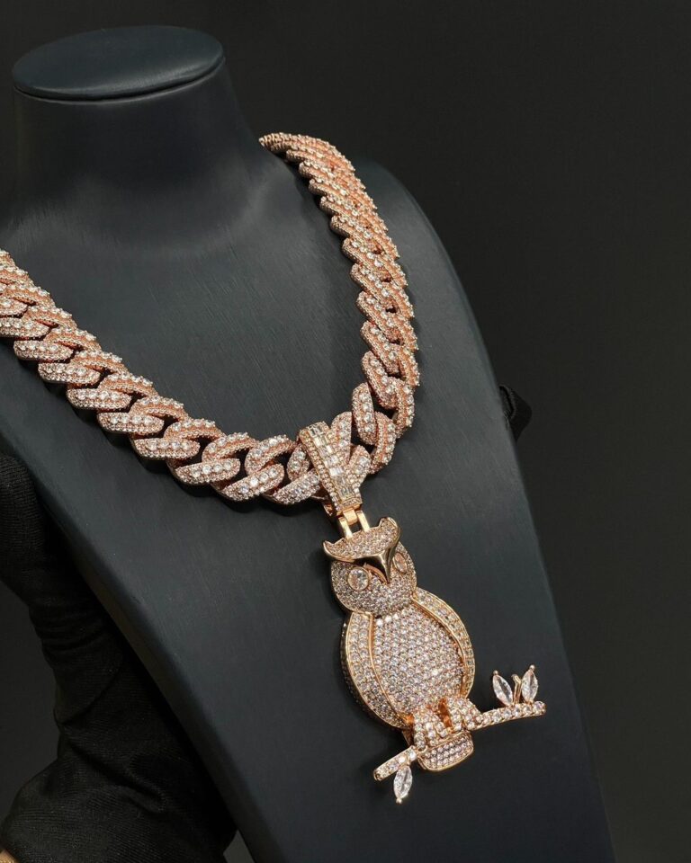 Fully iced owl pendant with Cuban chain – rose gold bust down moissanite piece