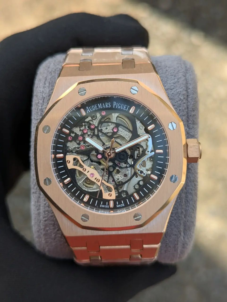 • Luxury Skeleton Design: Showcases intricate movement on a rose gold frame