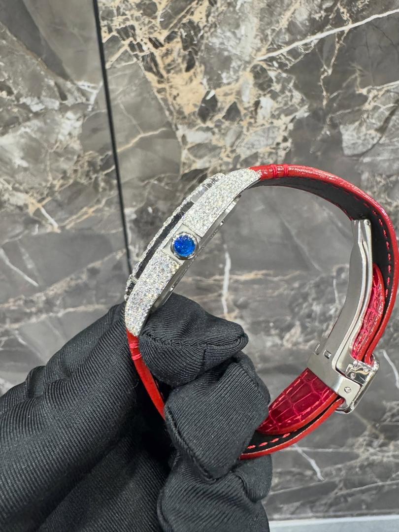 The red leather strap brings a bold contrast, adding color and personality to the full white ice setup. It’s comfortable, stylish, and perfect for anyone who likes mixing luxury with standout fashion. This combination of diamonds, skeleton design, and colored strap makes the watch hit different from regular pieces.