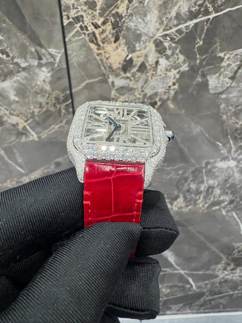 Cartier Santos Full White Ice Skeleton Diamond Watch with Red Leather Strap