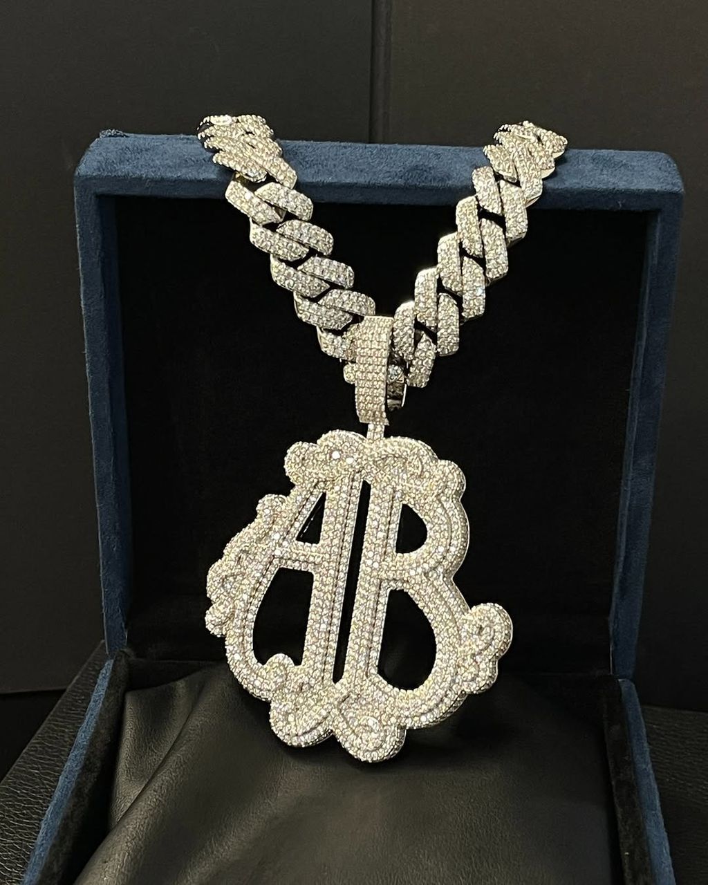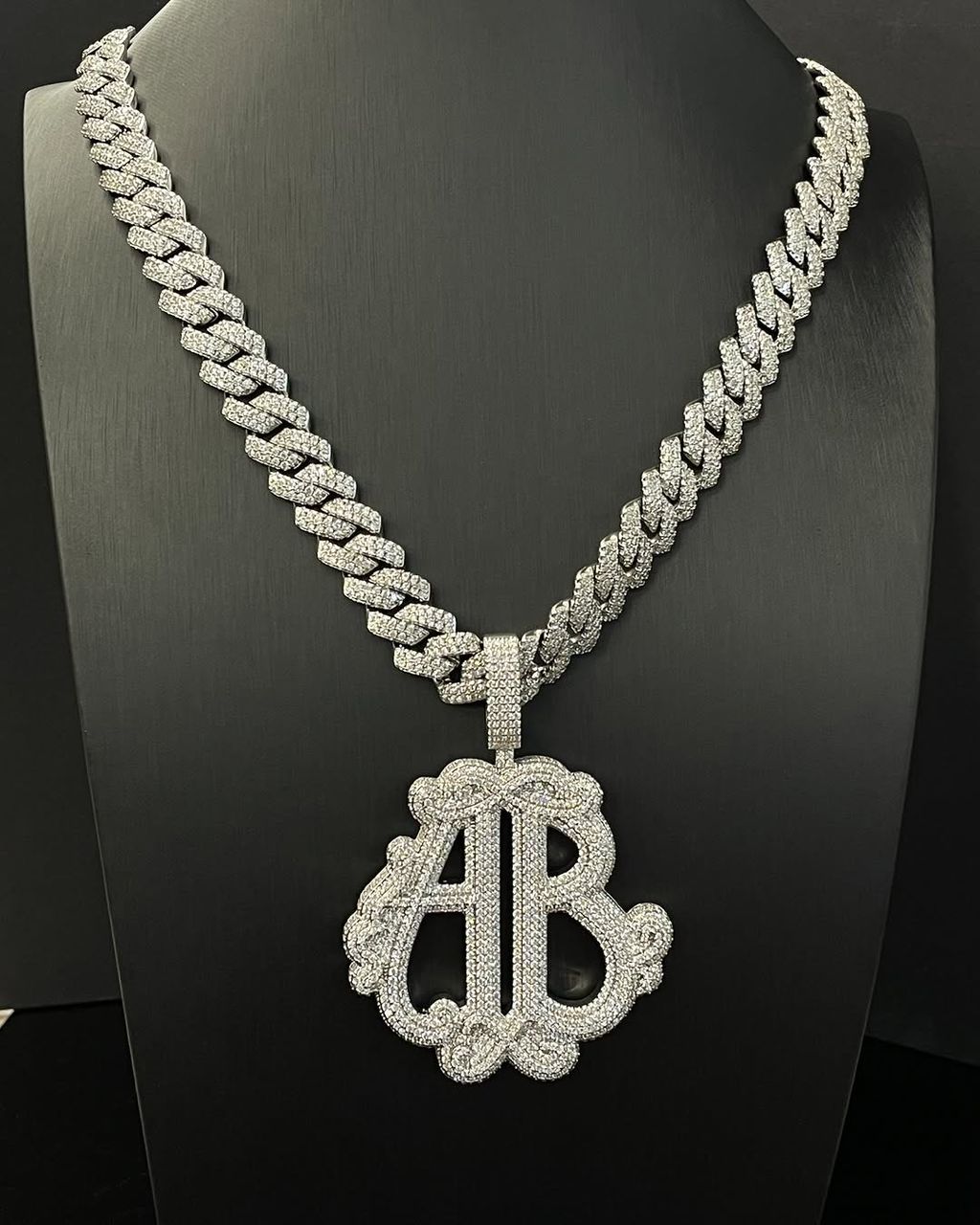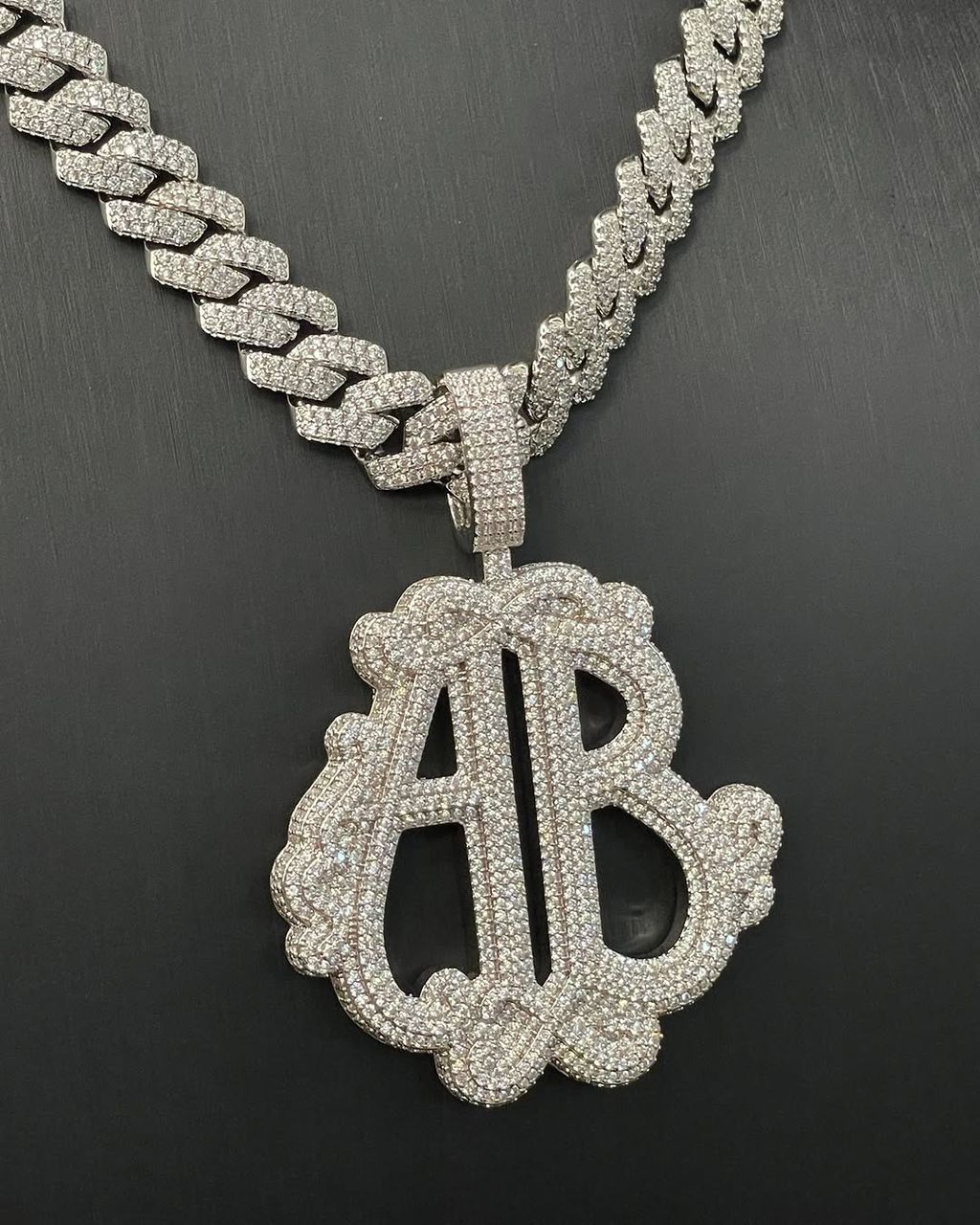 The pendant features a double-layered outline around the initials, giving it extra depth and a more premium feel. Every surface is covered in high-quality moissanite or premium stones, creating heavy brilliance and a smooth, flawless finish. The iced bail connects cleanly with the chain, keeping the shine flowing from top to bottom.