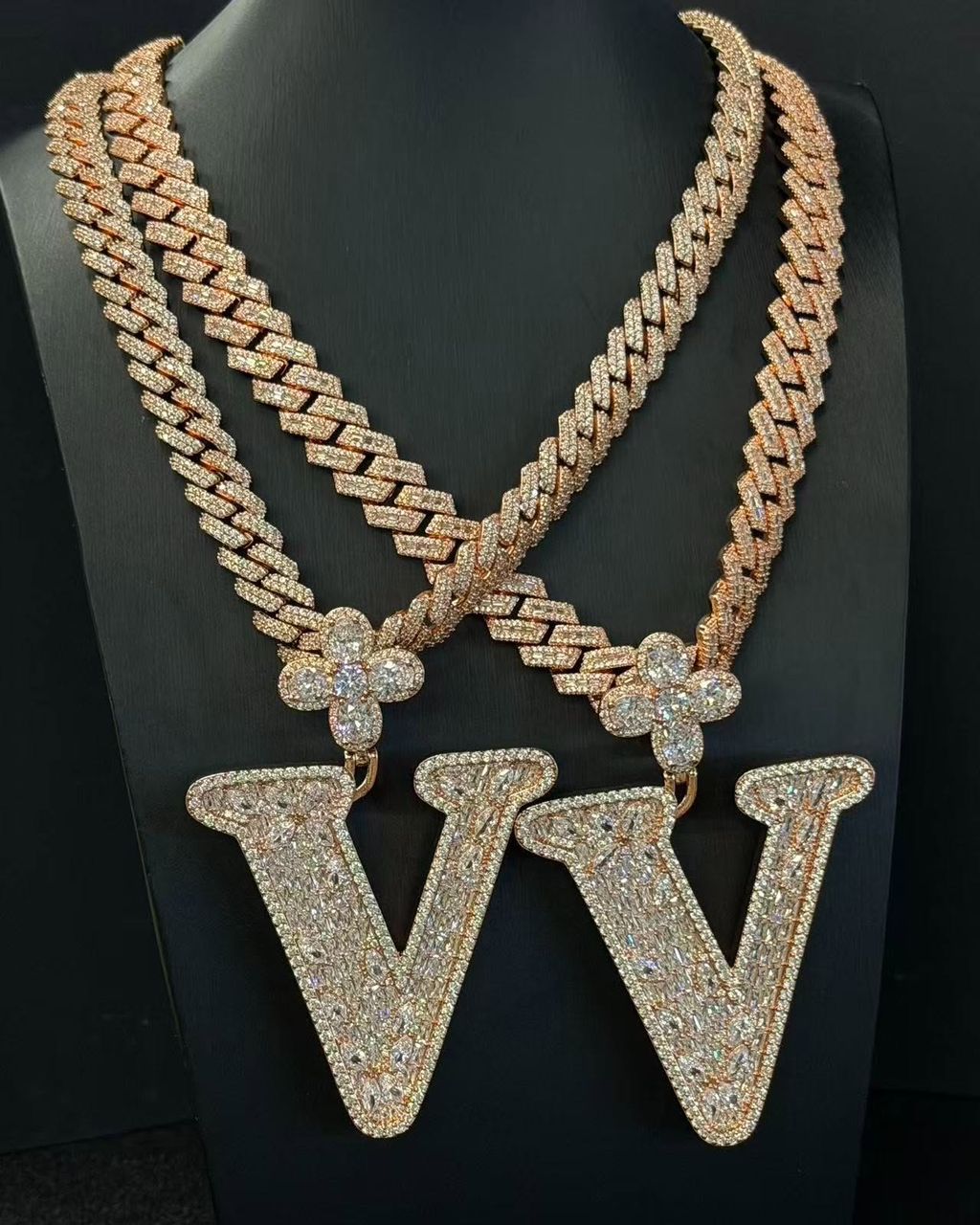 Explore pendants available in white, gold, and rose gold finishes, featuring both clean and moissanite iced designs. Each piece is crafted for durability and brilliance, making it perfect for everyday wear or statement styling.