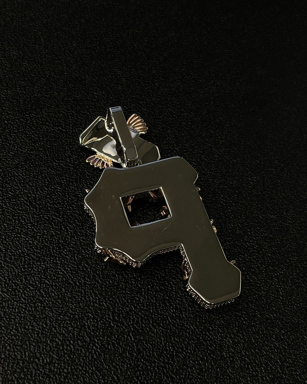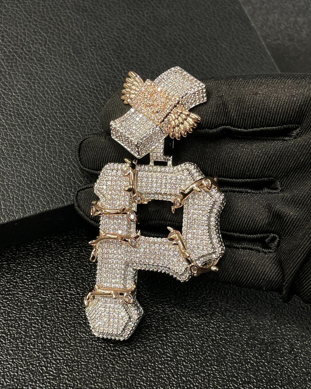 The top bail features a bold iced design with added wing detailing, bringing extra personality and making sure the shine flows from top to bottom. The mix of white ice stones with gold-tone accents gives this piece a unique contrast — clean brilliance with a touch of warmth and edge.
