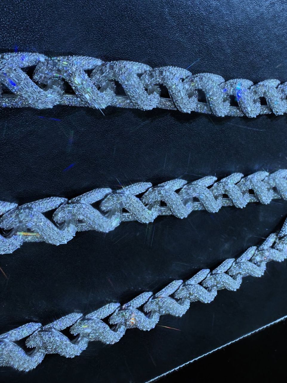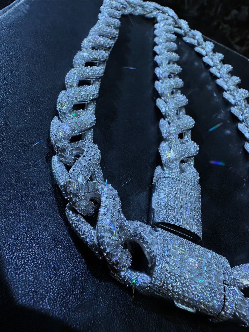 This high-end Cuban link chain is designed to make a powerful statement, featuring oversized links completely encrusted with shimmering stones for maximum brilliance. Every link is meticulously paved, creating an uninterrupted wave of sparkle that reflects light from every angle.