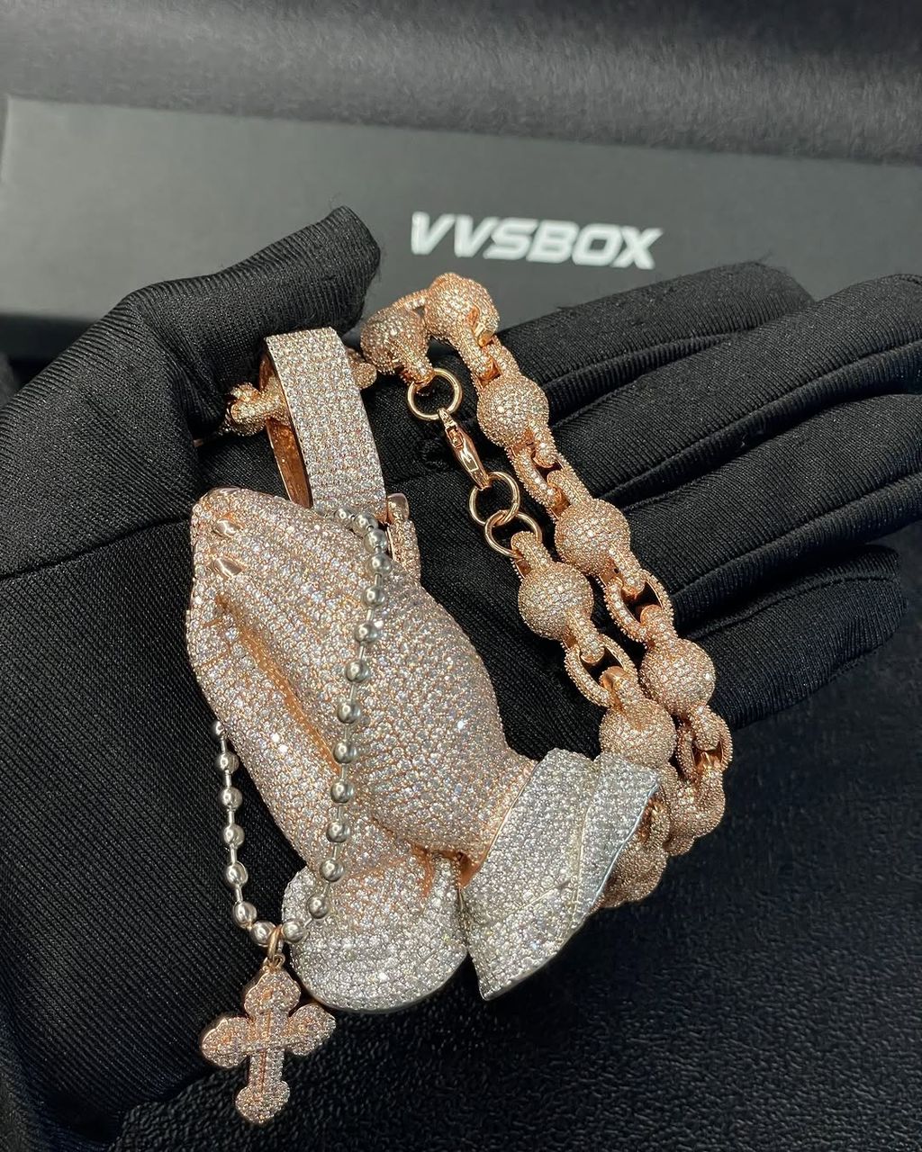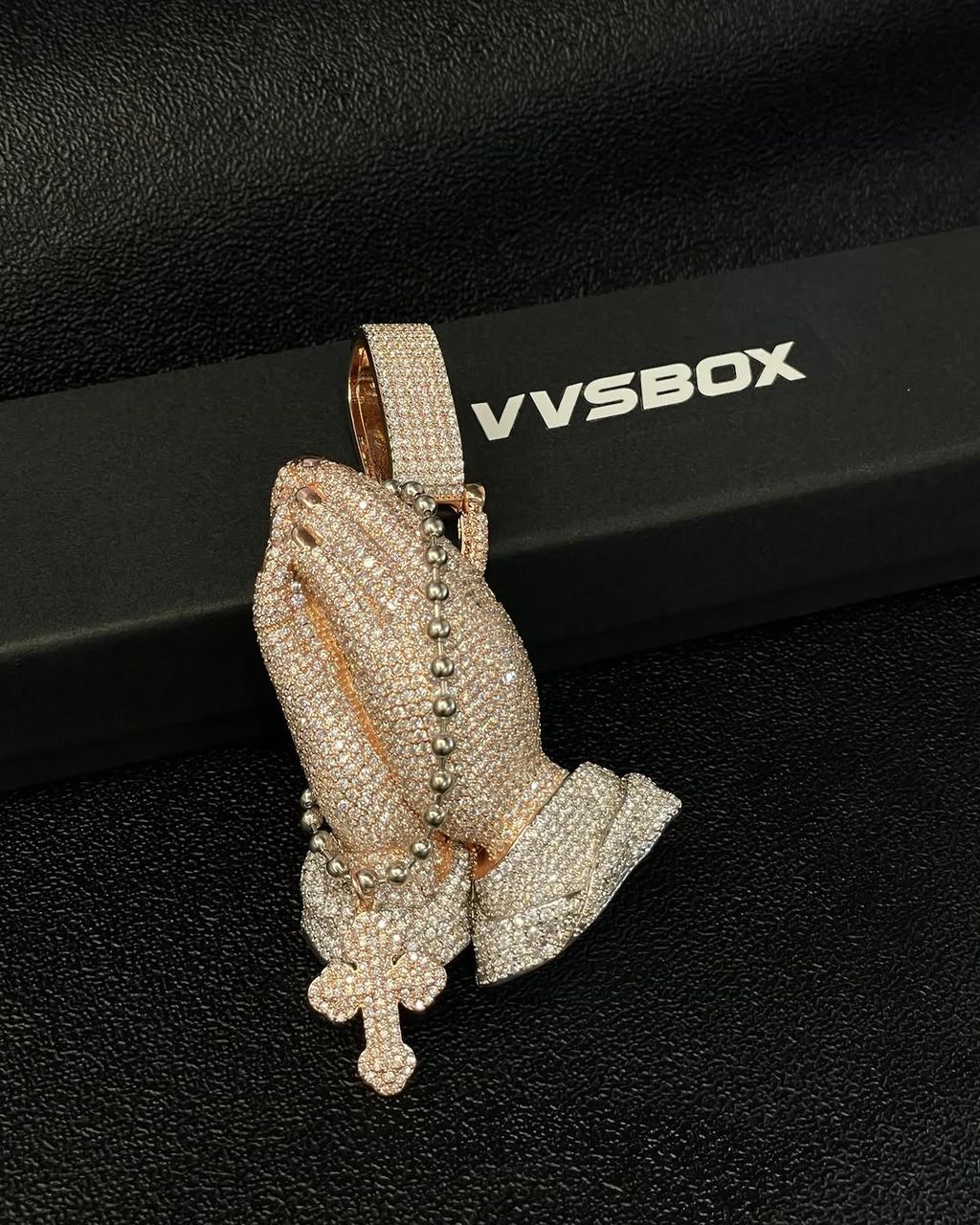 Fully Iced Praying Hands Pendant – Rose Gold Bust Down Moissanite Piece