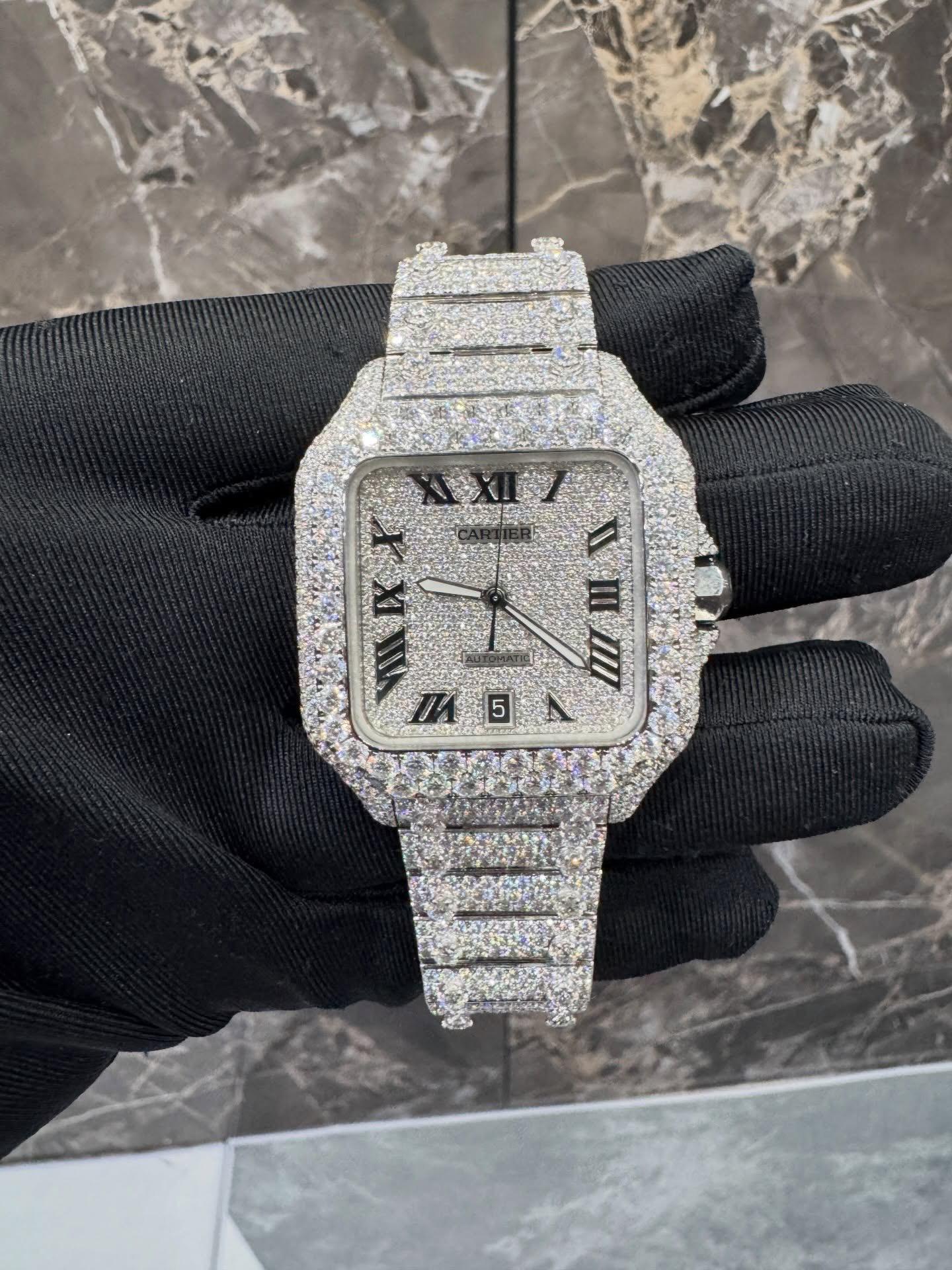 The dial stands out with elegant Roman numeral markers, adding a classic touch that contrasts perfectly with the modern iced aesthetic. A clean date display enhances functionality, while the textured, diamond-covered face elevates the watch’s visual depth.