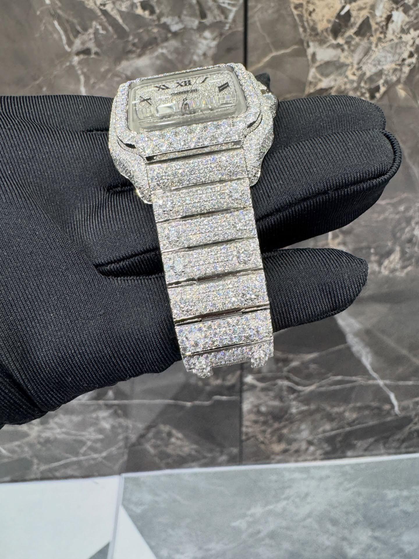 This premium iced-out watch features a bold square case design, completely covered in high-quality stones for an intense, all-over sparkle. From the bezel to the bracelet, every surface is meticulously set to deliver maximum brilliance and a true luxury presence.