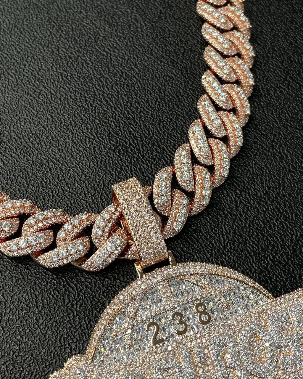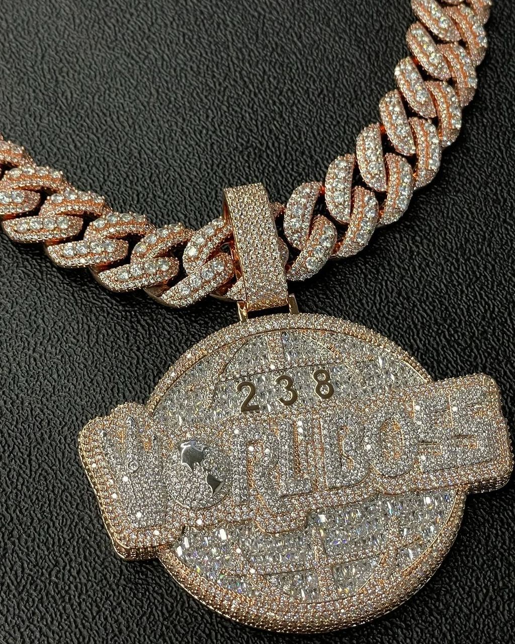 Paired with a thick fully iced Cuban link chain, this setup is built for strong presence on the neck. Every part of the piece is designed to reflect light and hold attention, making it perfect for anyone looking to stand out with meaning and style.