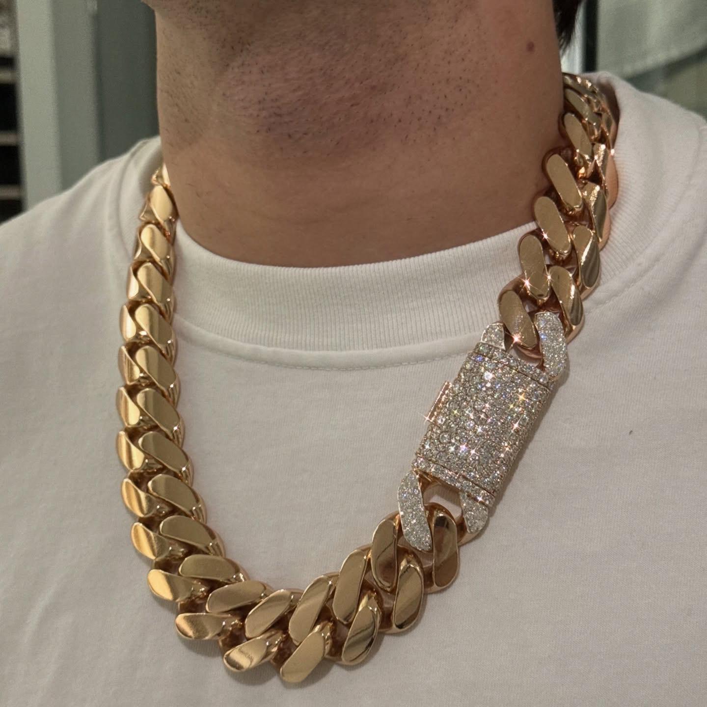 This bold Cuban link chain delivers a clean yet powerful statement, combining classic luxury with a modern iced finish. Crafted in a rich gold-tone, the chain features thick, tightly interlocked links that give it a strong, heavyweight presence around the neck.