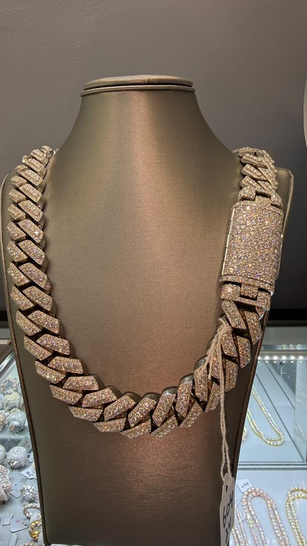 This stunning Cuban link chain is a true statement piece, designed for the bold and stylish. Made from high-quality materials, this chain is fully iced out with diamonds, sparkling with every move. The rose gold color gives it an elegant and luxurious touch, while the large diamond-encrusted clasp adds extra bling and sophistication. This heavy-duty, solid chain is a must-have for anyone looking to elevate their jewelry game. Whether you’re rocking a casual outfit or a formal look, this Cuban link chain will ensure you turn heads.