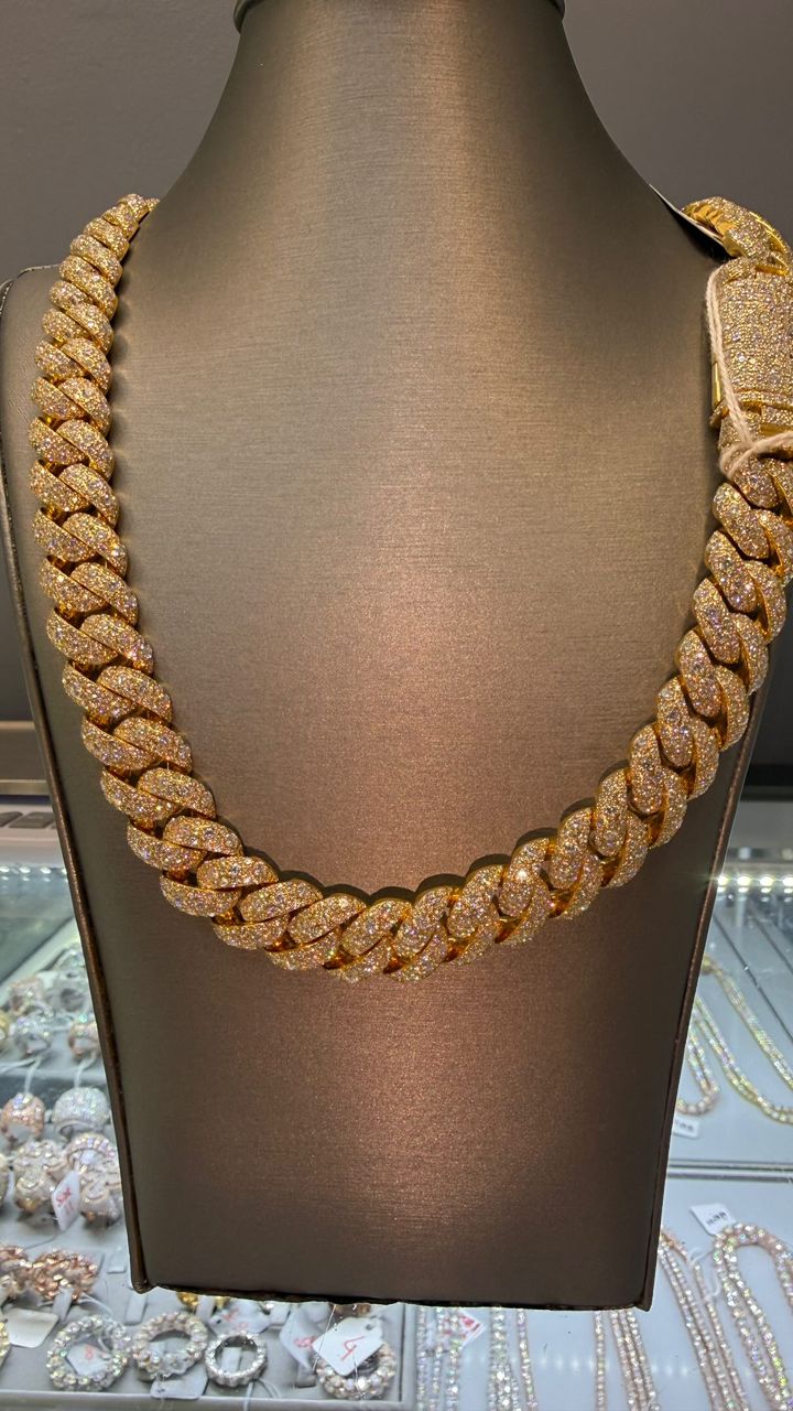 This is perfect for anyone who wants a standout iced-out Cuban link chain in yellow gold, fully encrusted with diamonds. A bold accessory for those who love to flex.