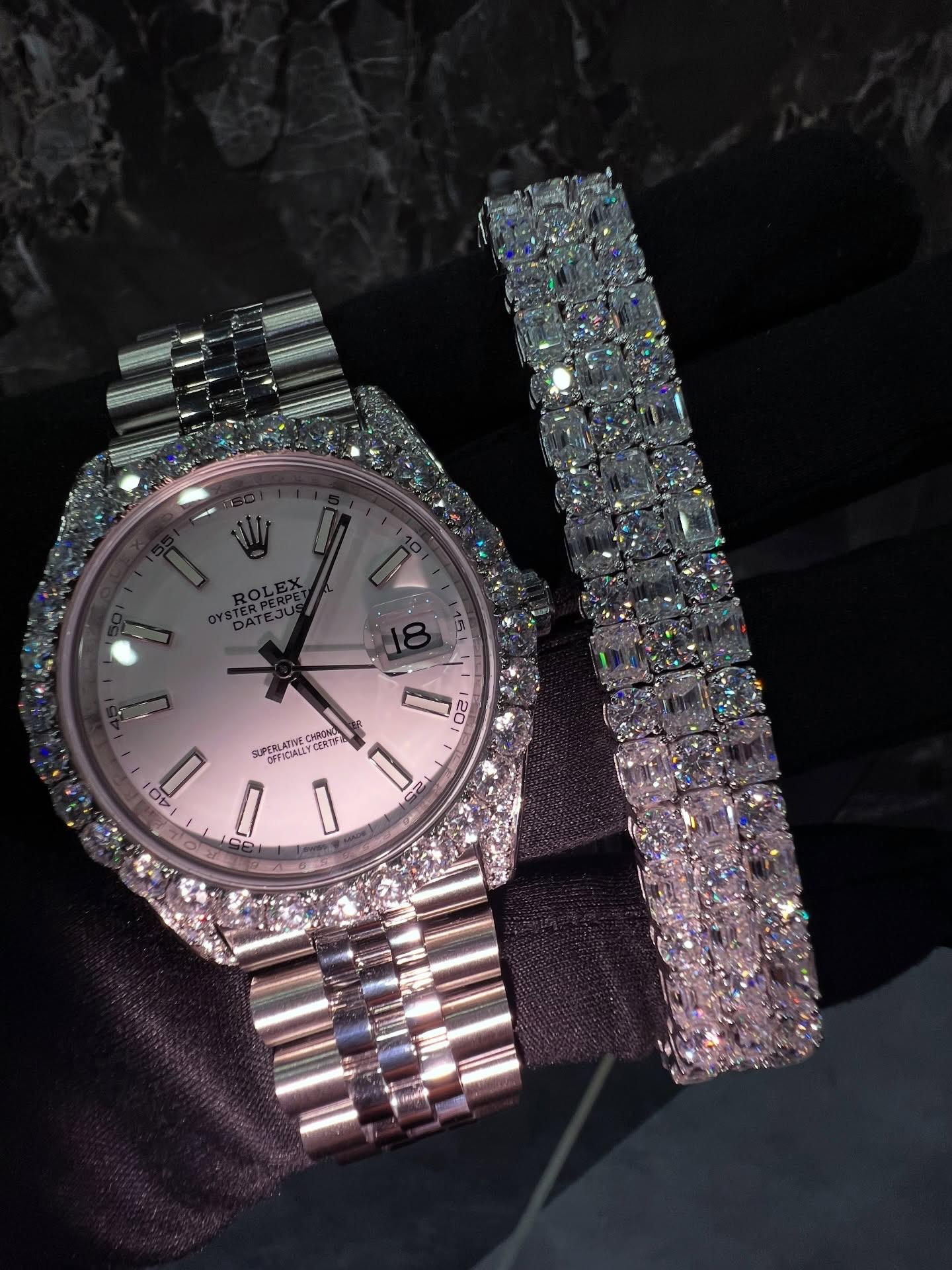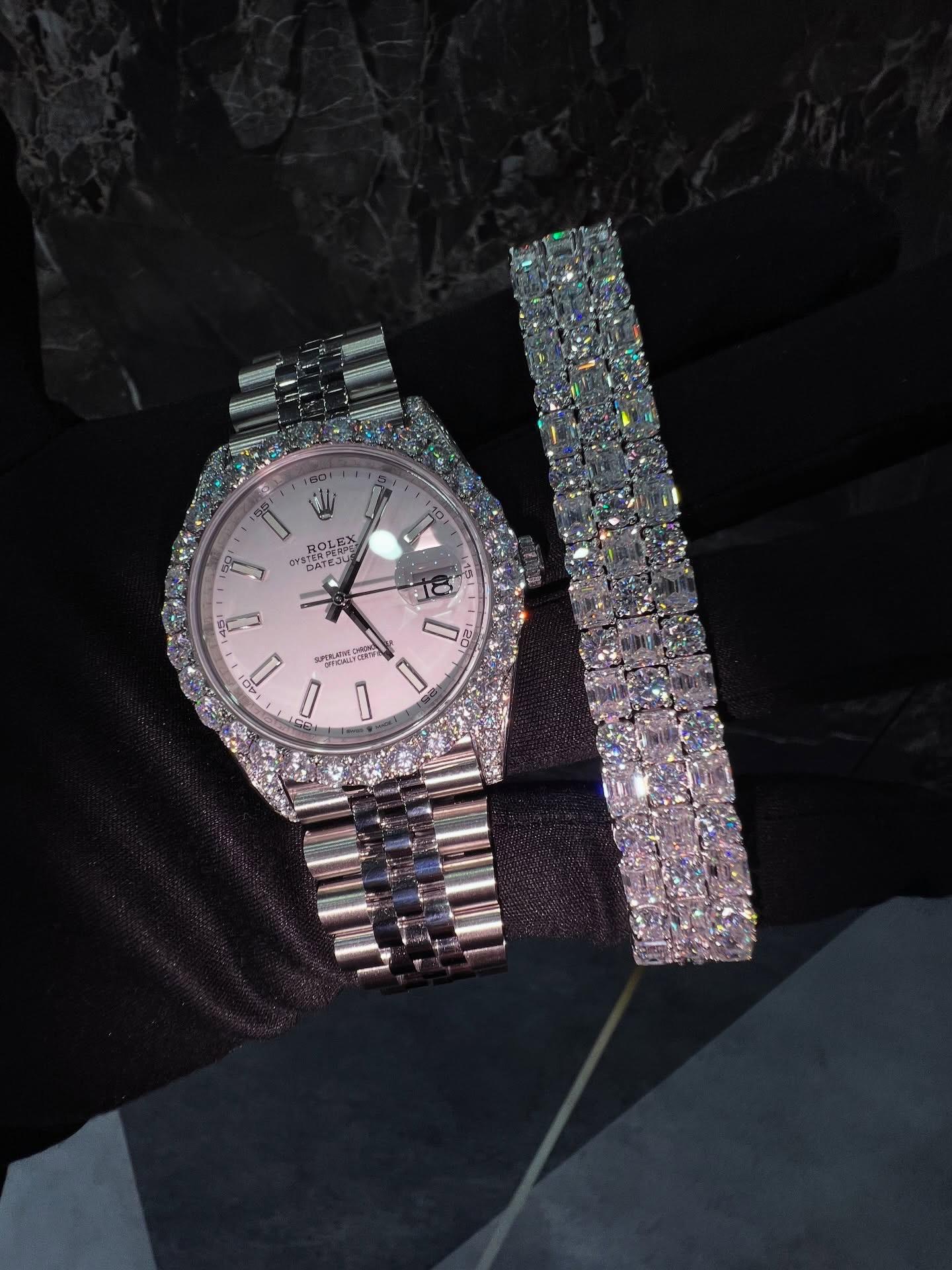 Complementing the watch is a fully iced baguette-cut bracelet, designed with rectangular stones arranged in a tight, uniform pattern. This gives off a sharp, high-end shine that stands out differently from traditional round stones, adding a more refined and premium feel to the set.