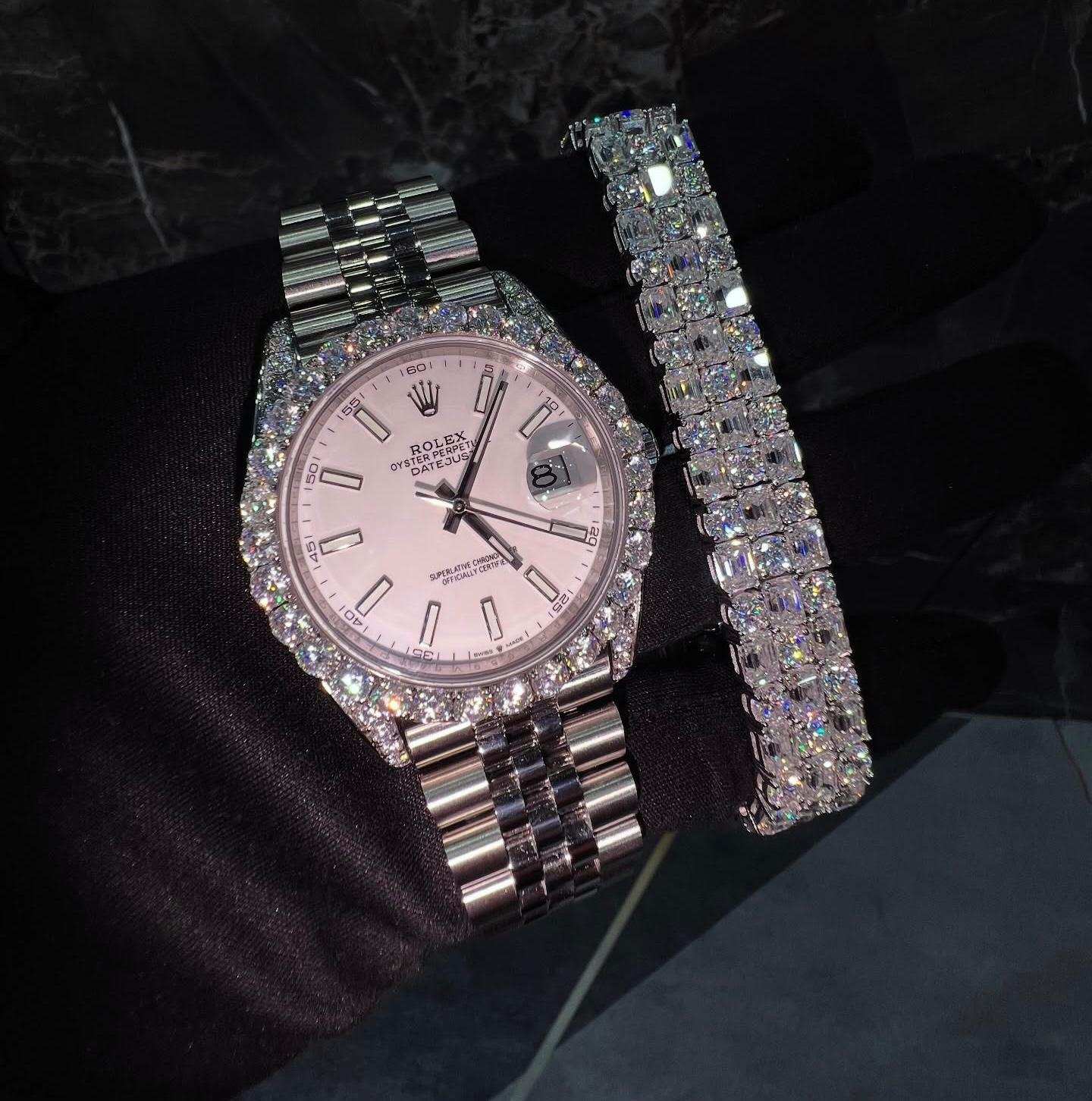 This sleek silver-tone luxury set pairs a fully iced watch with a high-shine baguette stone bracelet, delivering a clean and modern iced look. The watch features a Datejust-inspired design with a crisp white dial, simple hour markers, and a date display, giving it a timeless and versatile appeal.