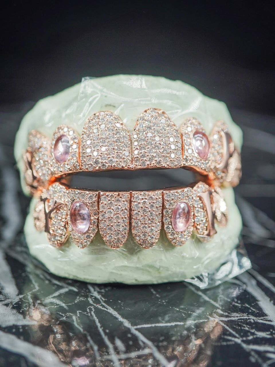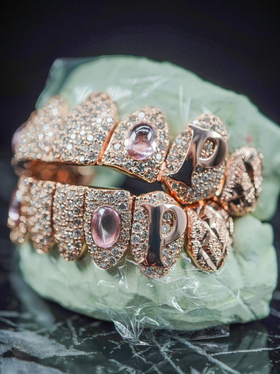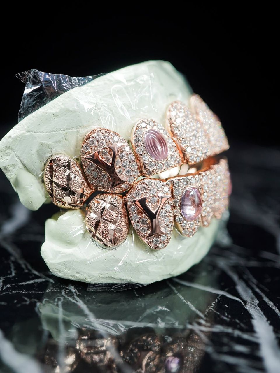 Finished in a rich rose gold tone, the grillz delivers a warm, radiant glow that enhances its luxurious appeal. Select teeth are highlighted with iconic LV-style engravings, while others are encrusted with high-quality stones that provide exceptional sparkle and brilliance. The inclusion of polished gemstone accents adds an extra layer of sophistication, elevating the overall design beyond traditional grillz.