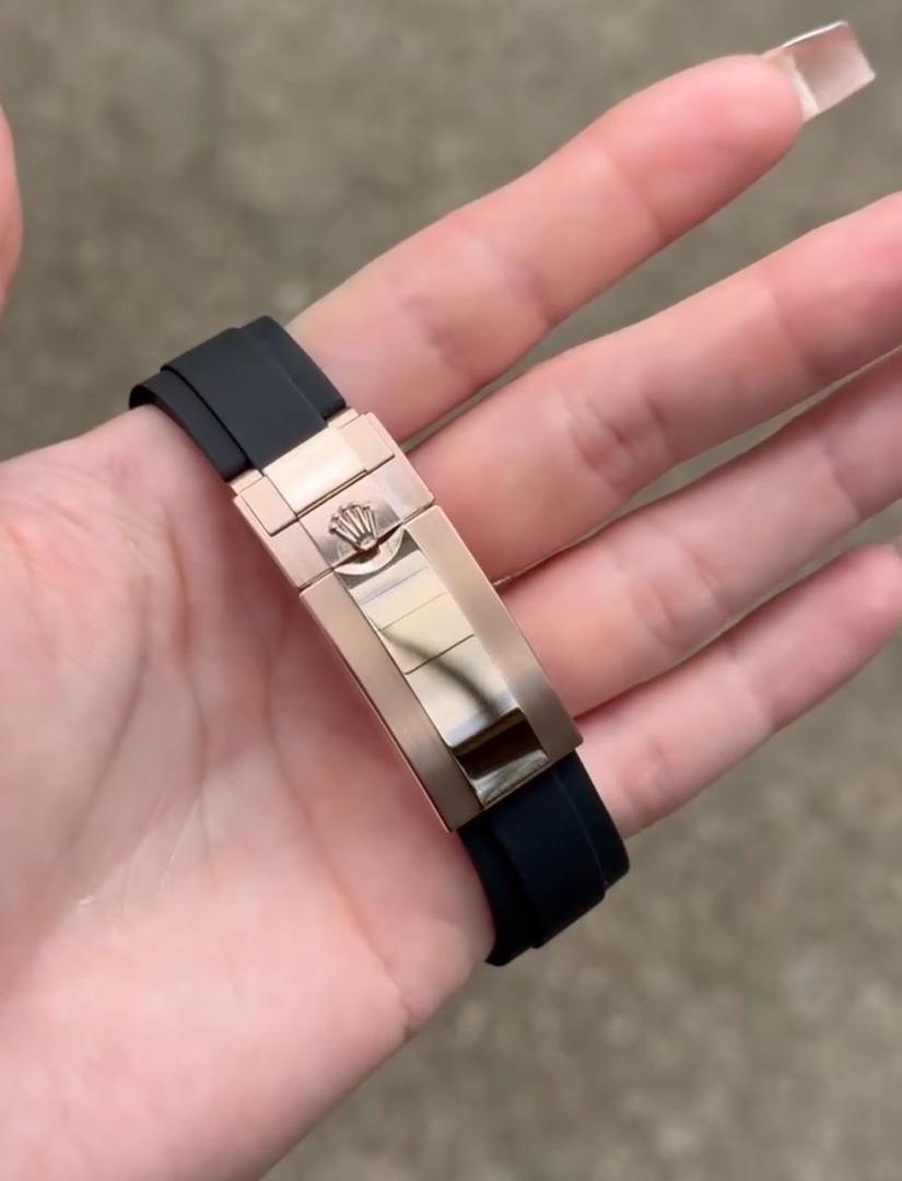Encased in a polished rose gold-tone stainless steel body, the watch exudes warmth and sophistication. The addition of a high-quality black rubber strap introduces a contemporary, sporty contrast, ensuring maximum comfort and flexibility for daily wear. This combination of materials makes the watch suitable for both active lifestyles and elegant occasions.