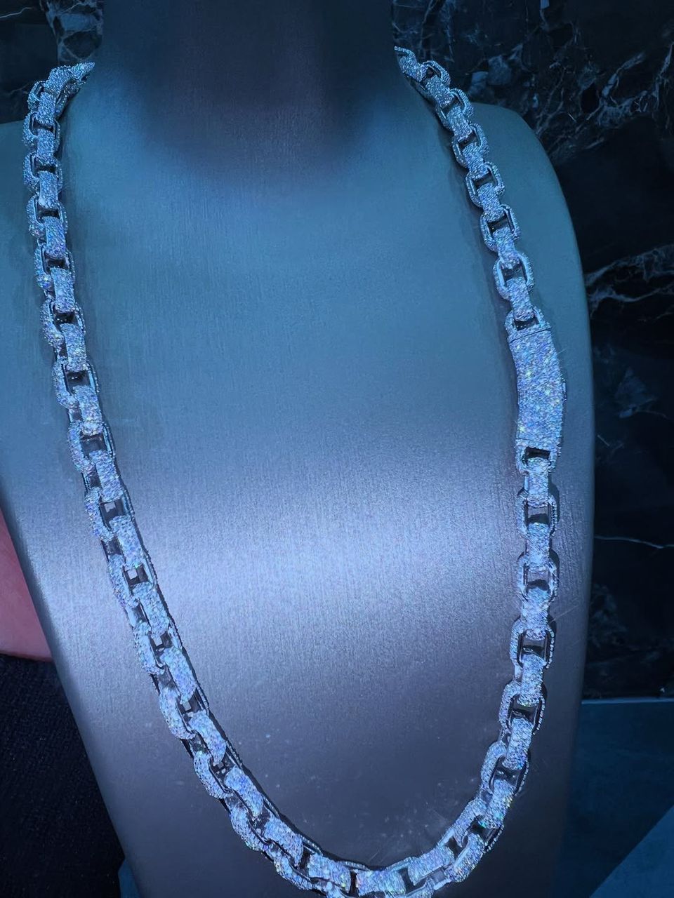 This standout chain features a unique rectangular link design, fully iced with high-quality stones for a sharp, modern luxury look. Unlike traditional Cuban links, the elongated rectangular links give it a more structured and distinctive appearance, making it perfect for those who want something different yet premium.
