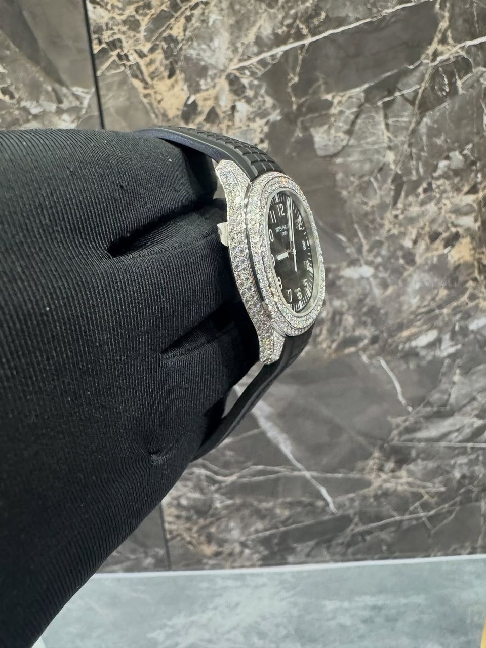 Patek Philippe Full White Ice Black Dial Diamond Watch with Rubber Strap