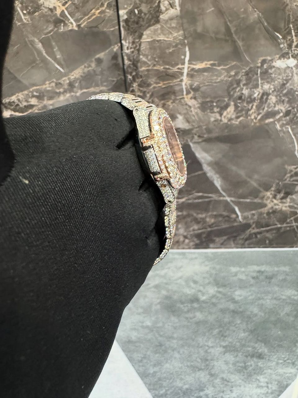 The bracelet is fully iced out, tight-set diamonds all through, giving that clean seamless drip. The rose gold details around the case and crown bring warmth to the piece, making it a perfect mix of flash and elegance.