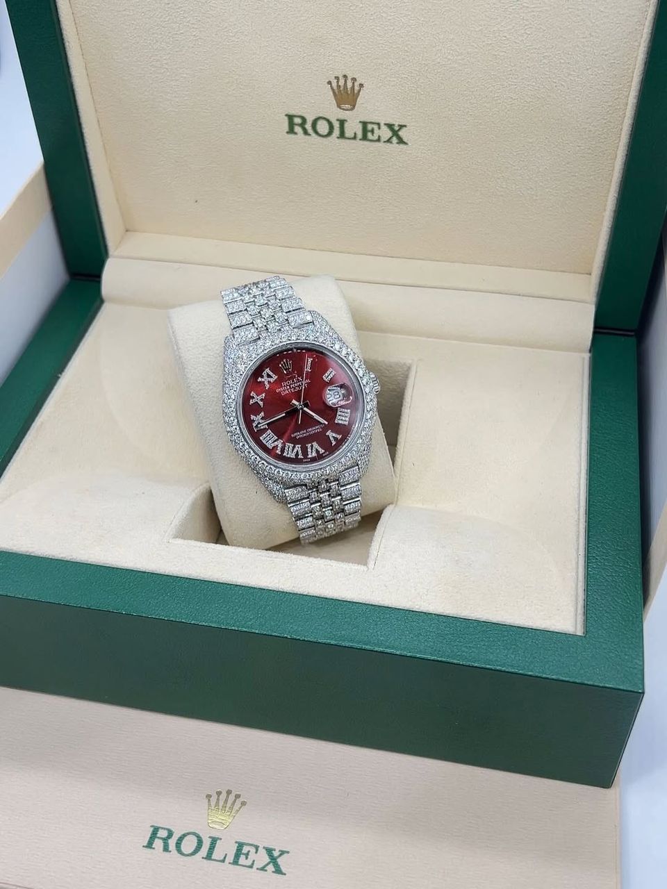 The deep red dial is what sets this watch apart. It adds a rich, standout vibe that instantly grabs attention while still keeping that classy Rolex feel. The Roman numeral markers are also iced, blending perfectly with the full white ice setup and giving the watch a premium, detailed finish.
