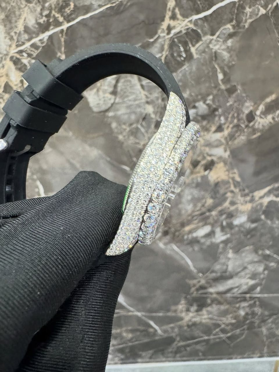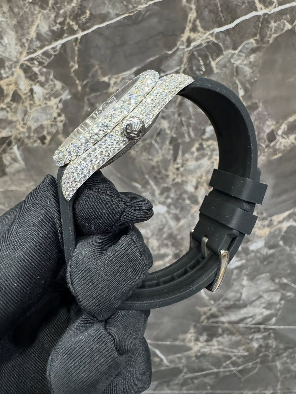 The watch is paired with a durable black Oysterflex rubber strap, offering a modern sporty feel while ensuring maximum comfort and flexibility for everyday wear. This combination of a luxurious iced-out case and a contemporary strap creates a perfect balance between elegance and versatility.