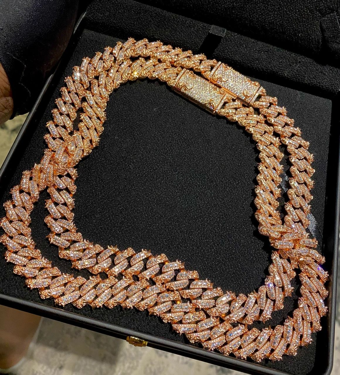 The necklace is set in a rich rose gold finish, giving it a warm and luxurious tone that contrasts beautifully with the icy diamonds. The rose gold adds a modern twist to a classic style, making it suitable for both everyday wear and special occasions. Whether you’re at a party, a casual outing, or even just flexing for the ‘gram, this necklace ensures you stand out from the crowd.