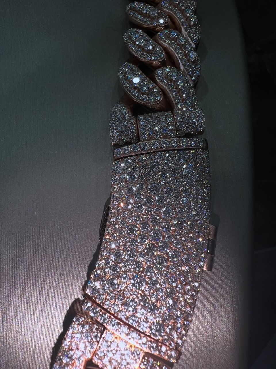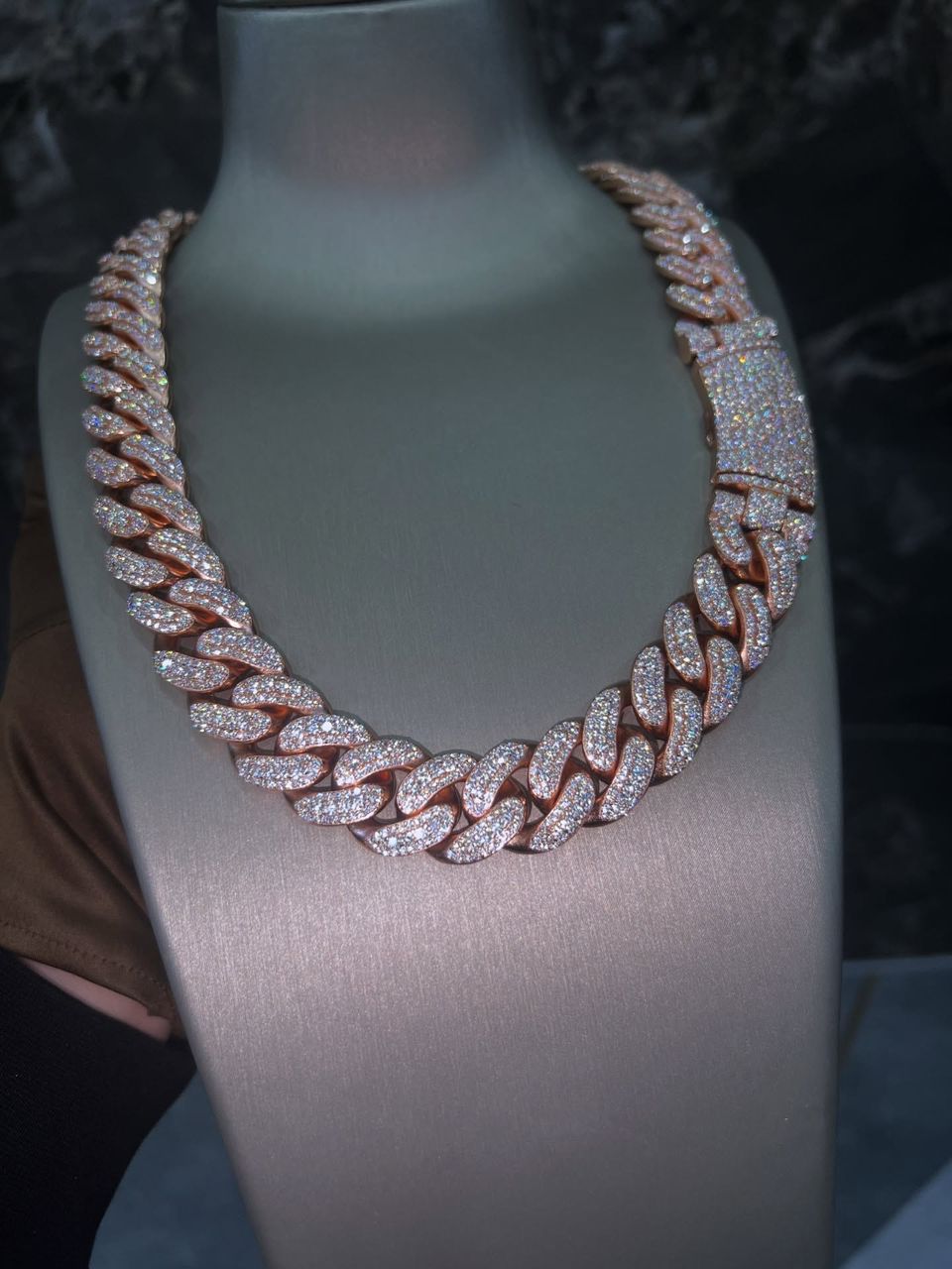 This premium Cuban link chain is crafted in a rich rose gold tone and fully iced with high-quality stones, delivering a bold and luxurious shine. Each oversized link is meticulously paved with shimmering stones, creating a continuous sparkle that stands out from every angle.