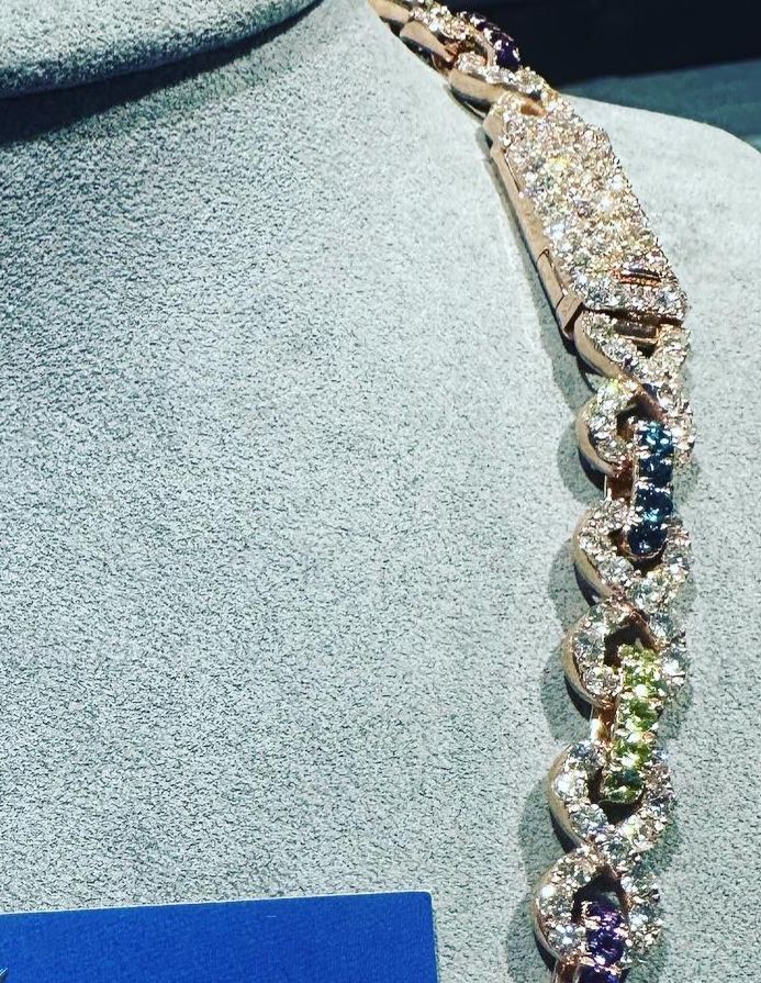 This luxurious multi-colored diamond and gemstone necklace from SV Jewelries is a statement piece that combines opulence and sophistication. Featuring an exquisite array of gemstones, each link is adorned with diamonds that sparkle brilliantly against the vibrant hues of sapphires, emeralds, rubies, and amethysts. The interplay of the precious stones creates a dazzling effect, while the rose gold setting adds warmth and elegance.
